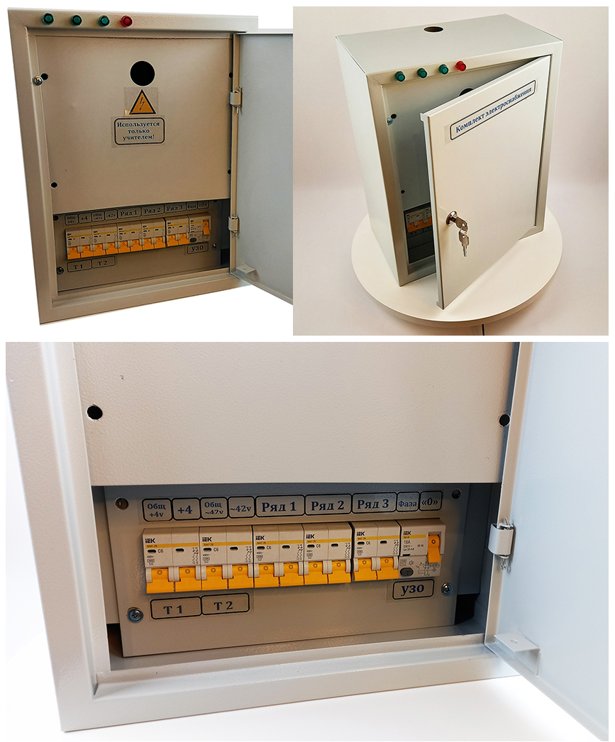 Комплект электроснабжения (КЭС) предназначен как для питания ИПФ (источника питания лабораторного для фронтальных работ) с переменным напряжением 42 В, так и для подачи напряжения 4 В на каждую парту в классе без ИПФ, для проведения лабораторных работ по физике, электротехнике, химии.